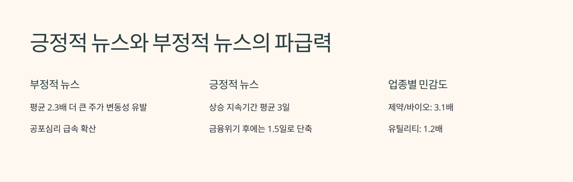 뉴스는 방향성뿐만 아니라 투자자들의 감정을 좌우하기도 합니다. 예를 들어, 실업률 감소나 기업의 실적 호조 뉴스는 주가를 끌어올리는 반면, 지정학적 리스크나 금리 인상 소식은 하락 압력을 줍니다. 특히 부정적 뉴스는 긍정적 뉴스보다 더 빠르고 강하게 반응하는 경향이 있어요. 이는 투자자들이 손실 회피 심리를 더 크게 갖기 때문인데요, '공포는 탐욕보다 빠르다'는 말이 괜히 나온 게 아니죠.